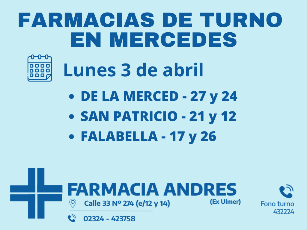 Desde las 8 30 del día de hoy hasta la misma hora de mañana las farmacias de turno en Mercedes son De la Merced, San Patricio y Falabella