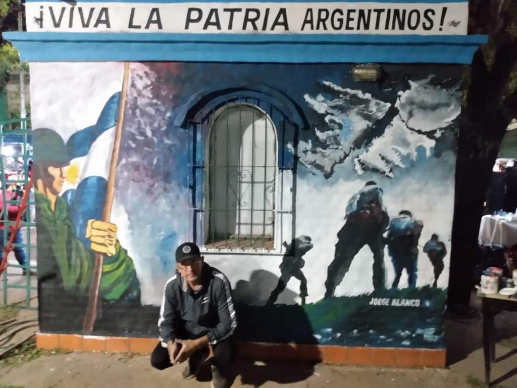 En el marco de la vigilia en San Andrés de Giles, sobre una pared de una pequeña construcción de la plaza, el artista plástico Jorge Blanco pintó un mural alusivo a Malvinas. Bautizó a su obra “Reivindicación”.
