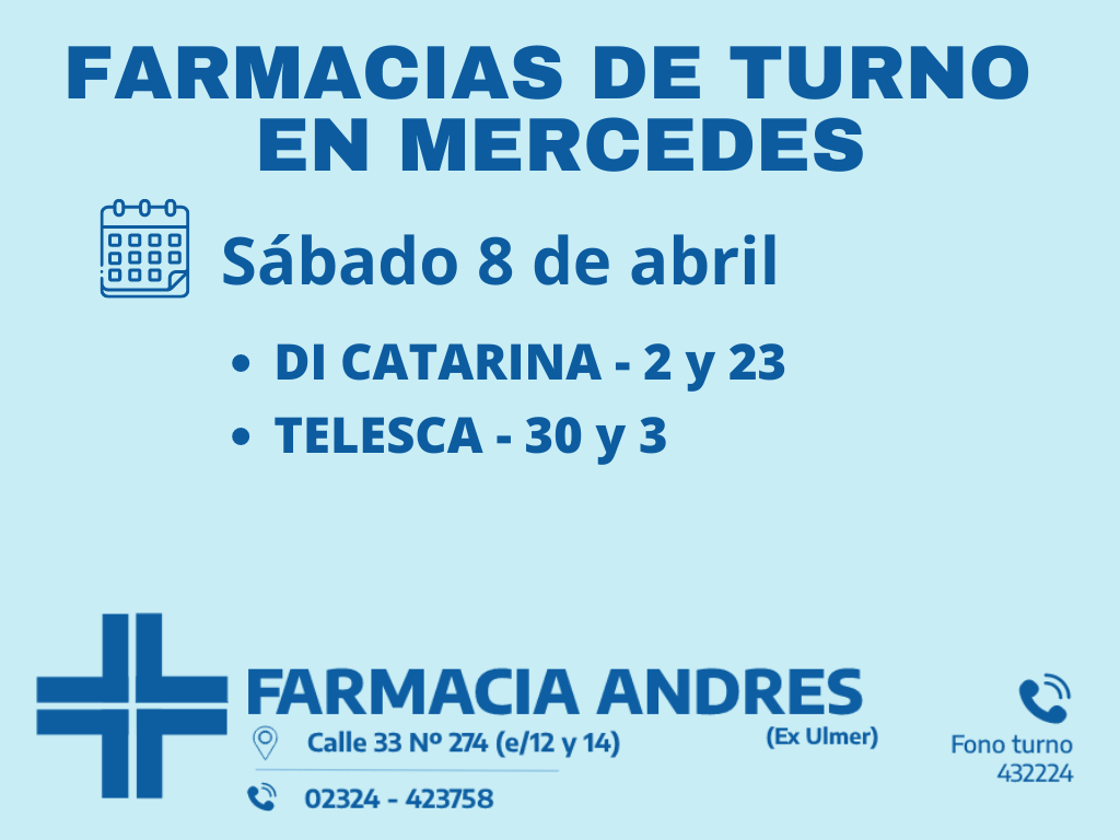 Farmacias de turno del sábado 8 de abril 8 abril, 2023Desde las 8:30 del día de hoy hasta la misma hora de mañana, las farmacias de turno en Mercedes son: Di Catarina y Telesca.Comparte esto: Haz clic para compartir en WhatsApp (Se abre en una ventana nueva) WhatsApp Haz clic para compartir en Telegram (Se abre en una ventana nueva) Telegram Haz clic para compartir en X (Se abre en una ventana nueva) X Haz clic para compartir en Facebook (Se abre en una ventana nueva) Facebook TE PUEDE INTERESARCOMENTARIOS Comentarios