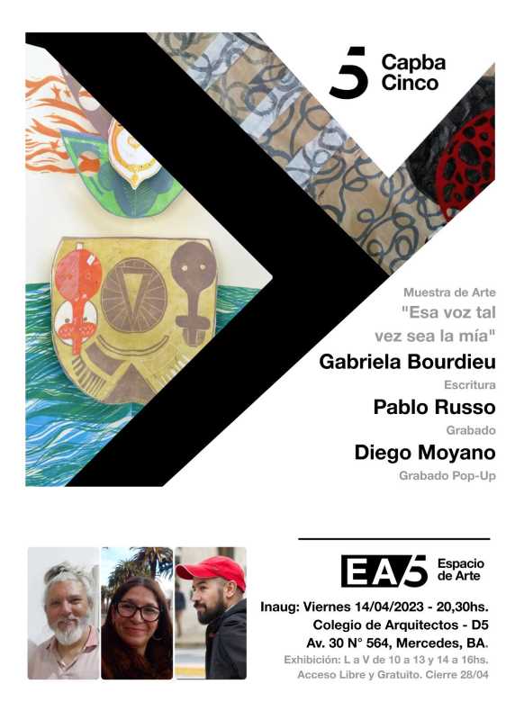 La próxima exposición a realizarse en la Sede del Colegio de Arquitectos Distrito5. , será el día viernes 14 de abril del corriente a las 20:30hs, en Av. 30 No. 564. Expondrán serán los artistas Gabriela Bourdieu (escritura), Pablo Russo (grabado) y Diego Moyano (grabado Pop– up) con su muestra titulada “Esa voz tal vez sea la mía”