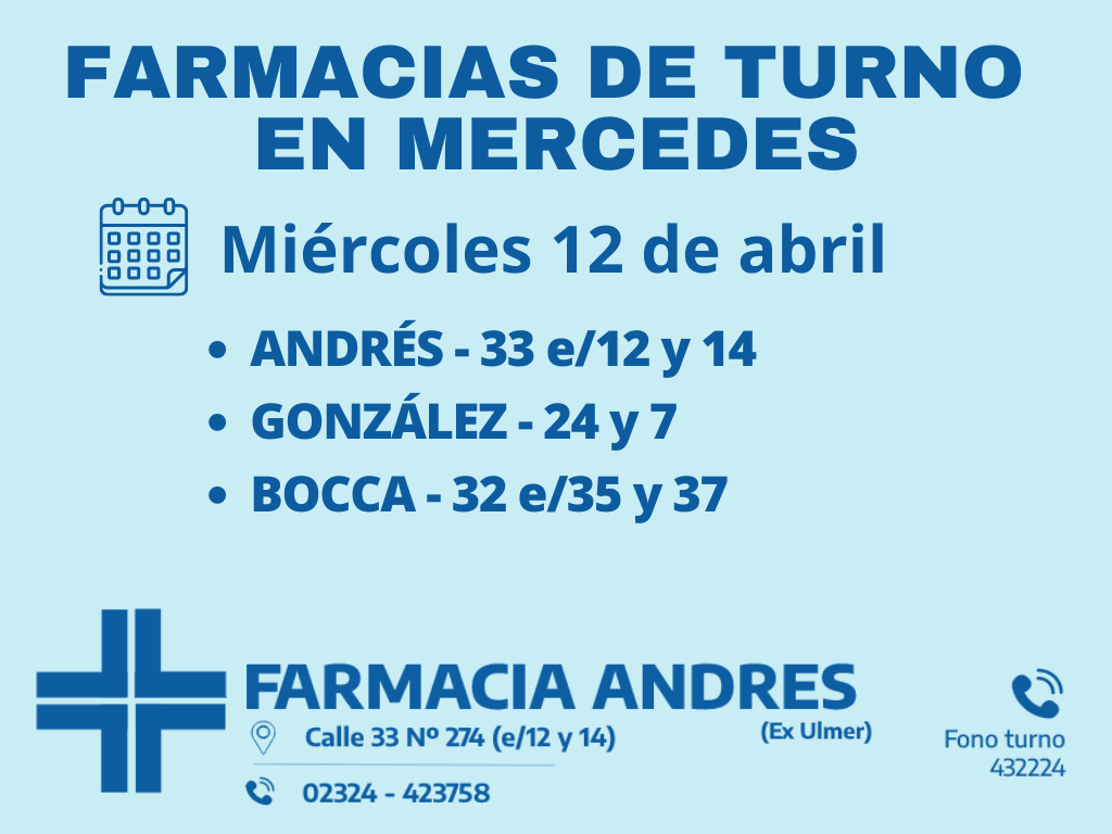 Desde las 8:30 del día de hoy hasta la misma hora de mañana, las farmacias de turno en Mercedes son: Andrés, González y Bocca.
