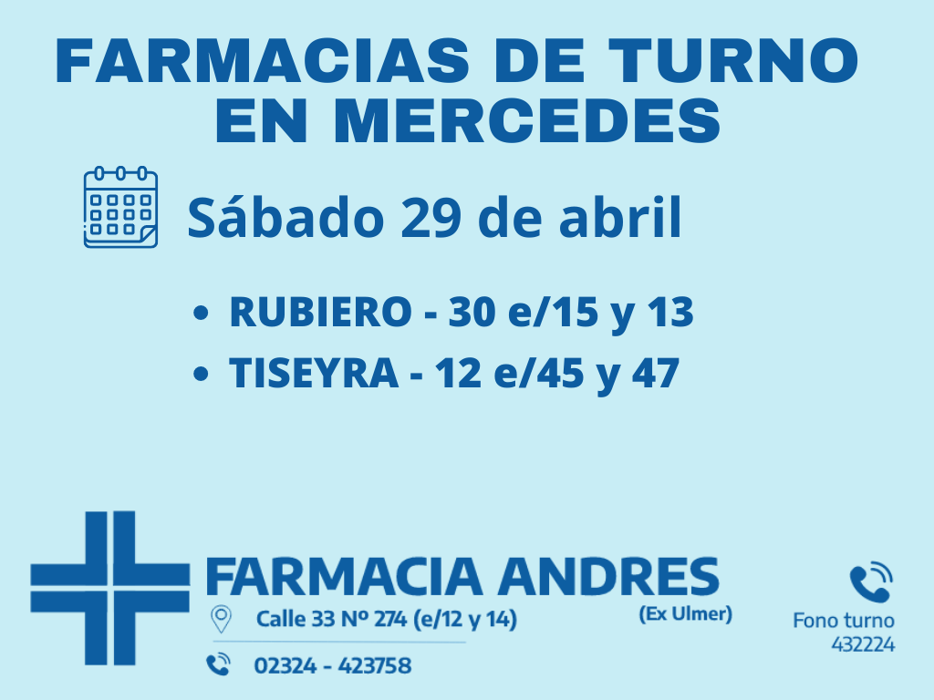Farmacias de turno del sábado 29 de abril 29 abril, 2023Desde las 8:30 del día de hoy, hasta la misma hora de mañana, las farmacias de turno en Mercedes son Rubiero y Tiseyra.Comparte esto: Haz clic para compartir en WhatsApp (Se abre en una ventana nueva) WhatsApp Haz clic para compartir en Telegram (Se abre en una ventana nueva) Telegram Haz clic para compartir en X (Se abre en una ventana nueva) X Haz clic para compartir en Facebook (Se abre en una ventana nueva) Facebook TE PUEDE INTERESARCOMENTARIOS Comentarios