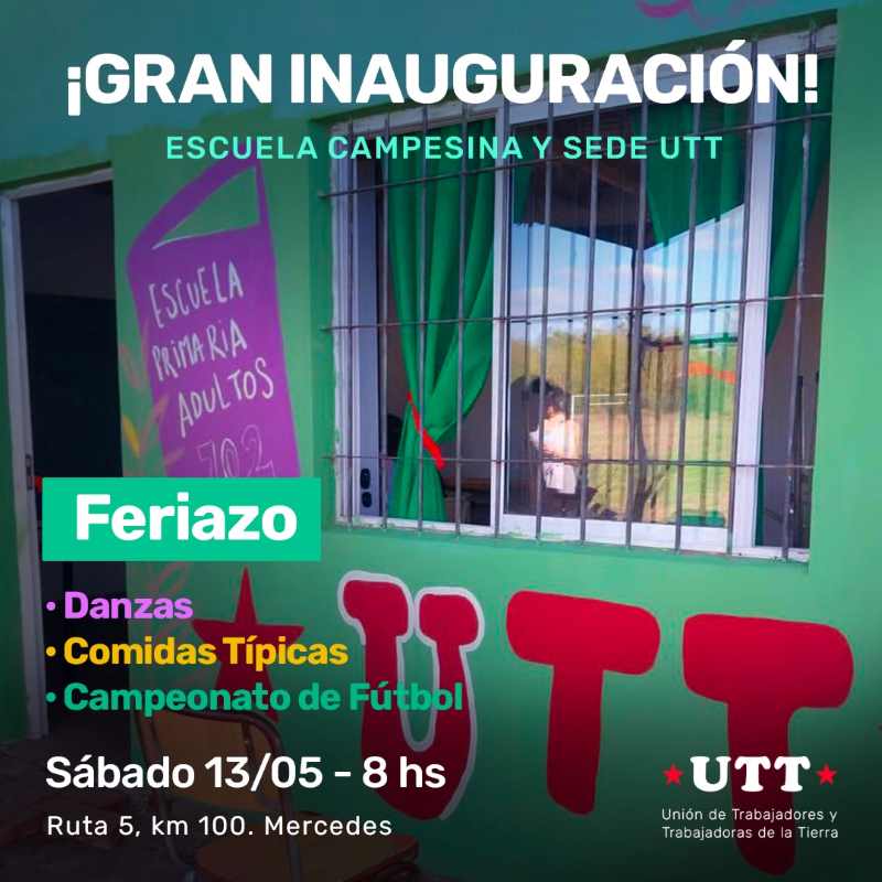 El venidero sábado 13 de mayo se llevará adelante la inauguración de la sede rural de la Escuela Primaria N° 702 para adultos y de la UTT. A partir de la hora 8, en la Ruta 5 kilómetro 100, la Unión de Trabajadores y Trabajadoras de la Tierra (UTT) formalizará el espacio educativo del nivel primario para los mayores de 18 años de la zona rural y su sede social.