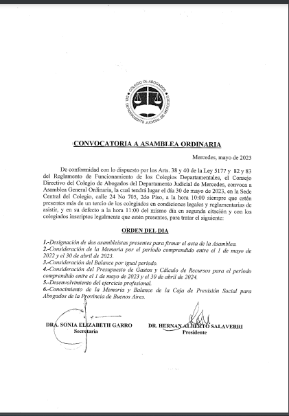 El Colegio de Abogados del Departamento Judicial Mercedes convoca a Asamblea General Ordinaria. Será el día 30 de mayo, en la sede de la institución a partir de la hora 10. El orden del día se comparte en esta publicación.
