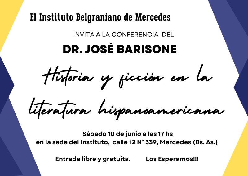 Los miembros del Instituto Belgraniano de de Mercedes llevarán adelante una conferencia que relaciona la literatura y la historia. La charla estará a cargo del reconocido profesor mercedino y Doctor en Letras, José Barisone. La disertación se titula: «Historia y ficción en la literatura hispanoamericana».