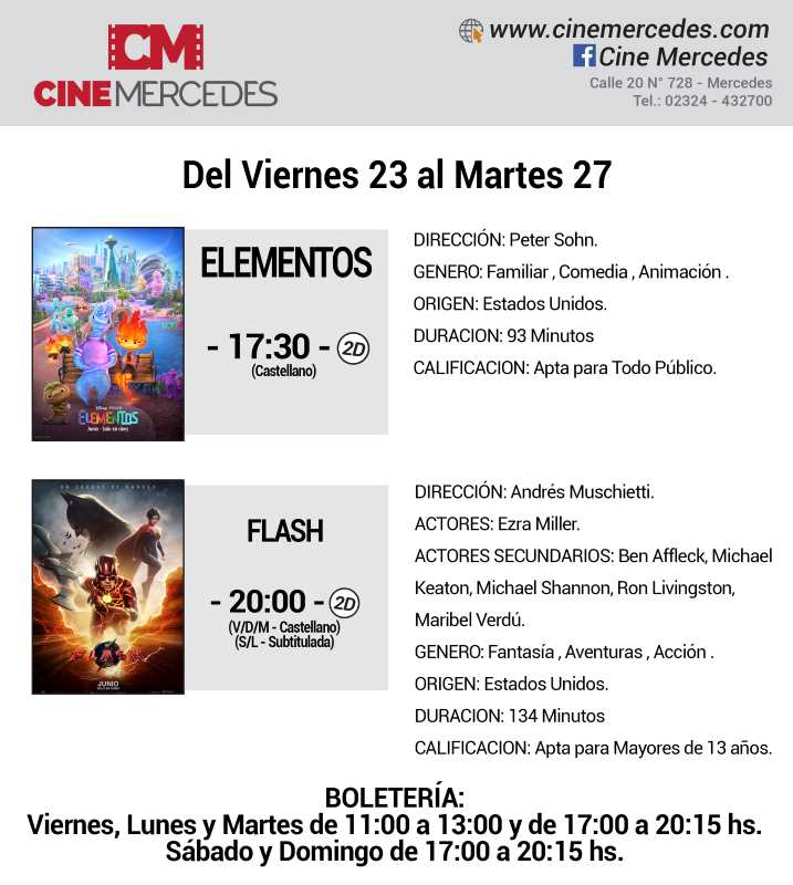 El Cine Mercedes anunció la continuidad de la proyección de dos películas esperadas por el público general. En las funciones de las 17:30, la película de animación «Elementos» se podrá ver desde el viernes 23 al martes 27 de junio. Los mismos días, pero en las funciones de la hora 20, podrá verse «Flash».