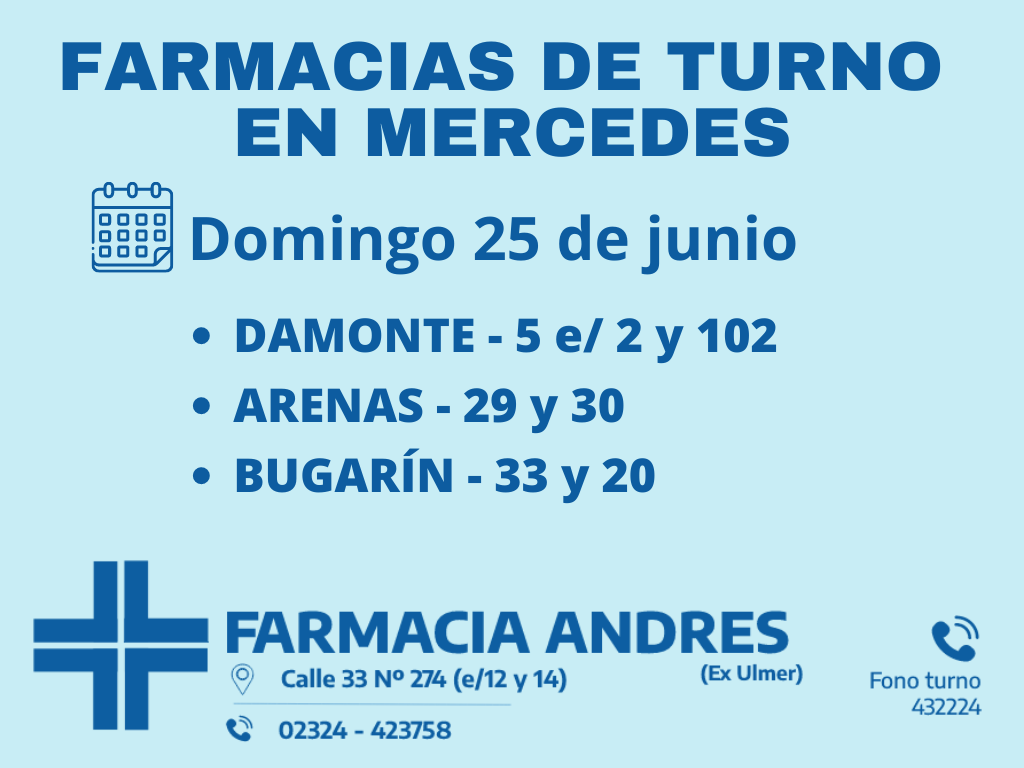 Desde las 8:30 del día de hoy hasta la misma hora de mañana, las farmacias de turno en Mercedes son: Damonte, Arenas, y Bugarín.