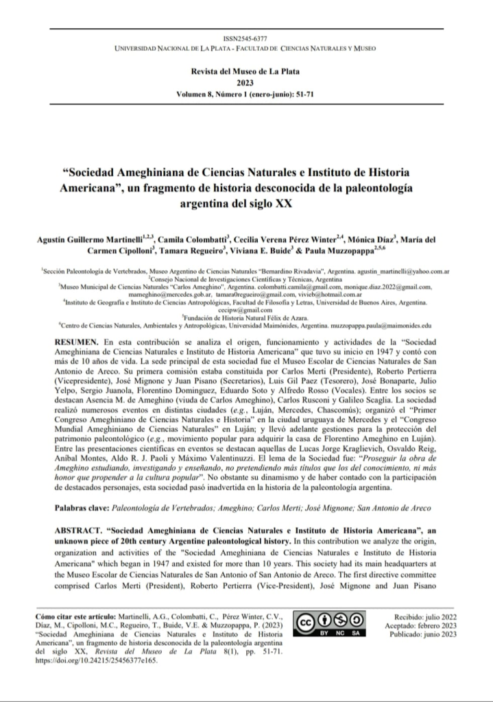 En esta ocasión, publican en la Revista del Museo de La Plata la investigación realizado por los Dres. Agustín Martinelli, Cecilia Pérez Winter (Asesores Ad honorem del MCA); la Dra. Paula Muzzopappa (CONICET; Fundación de Historia Natural Félix de Azara y Centro de Ciencias Naturales, Ambientales y Antropológicas de la Universidad Maimónides); y personal del Museo Carlos Ameghino.