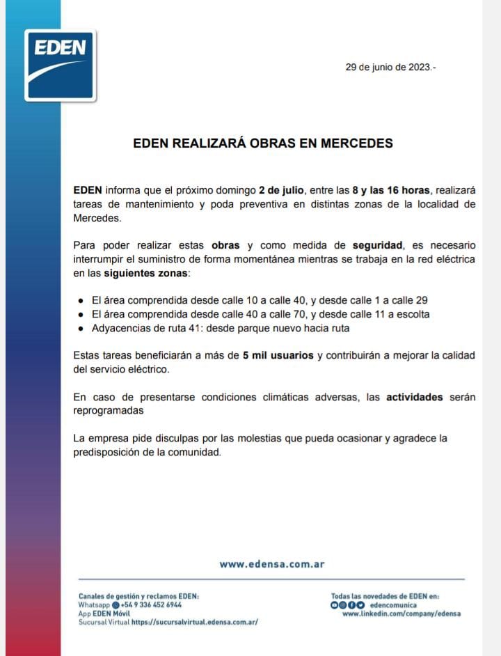 Desde la empresa distribuidora de energía eléctrica de Mercedes informaron que el próximo domingo habrá un corte de luz «muy amplio con alcance a 5000 usuarios».