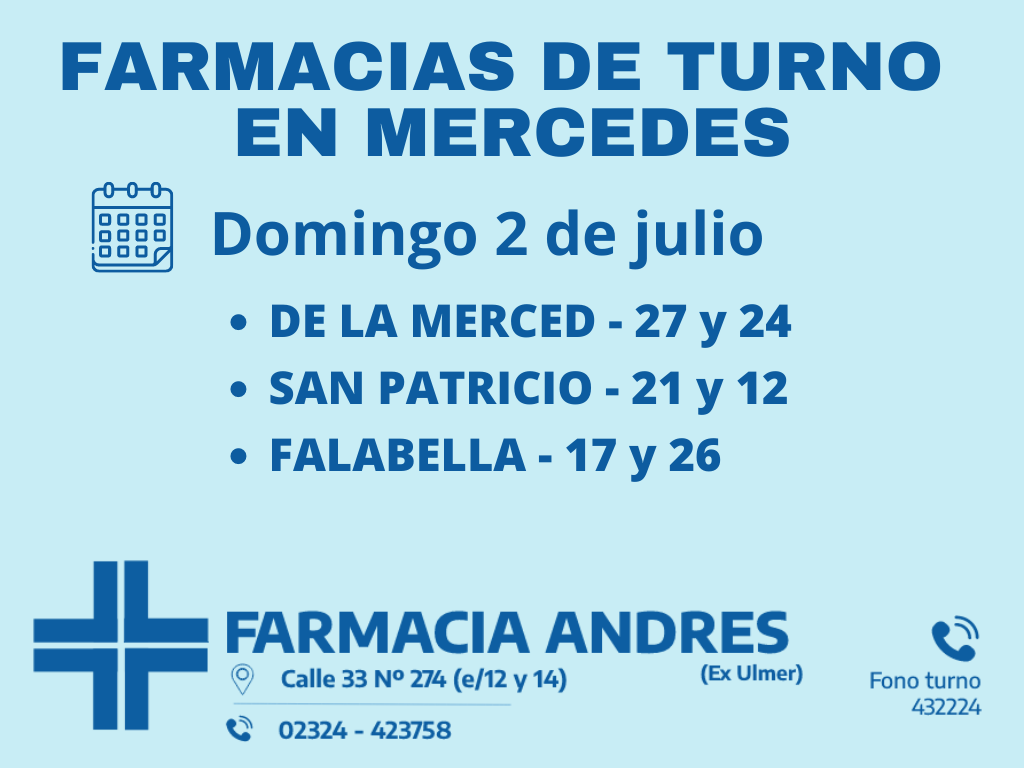 Desde las 8:30 del día de hoy hasta la misma hora de mañana las farmacias de turno en Mercedes son De la Merced, San Patricio y Falabella.