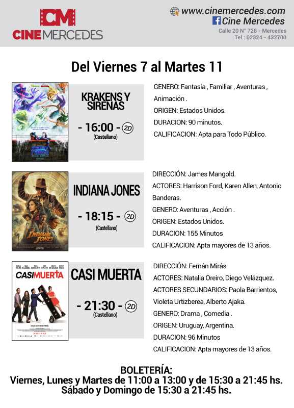 Desde el viernes 7 al martes 11 de julio, el Cine Mercedes proyectará tres películas para elegir. En cartelera continúan «Krakens y Sirenas» e «Indiana Jones» y se agrega la película argentina «Casi Muerta» con Natalia Oreiro.