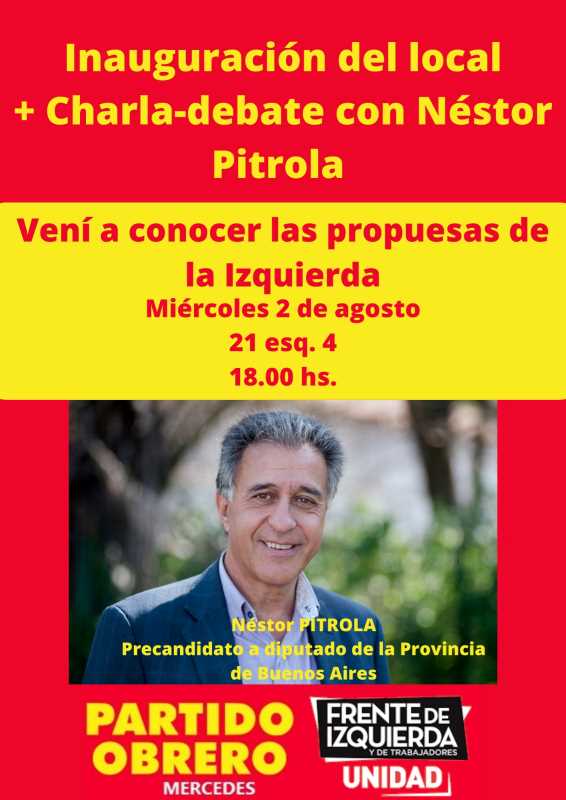 Pitrola, brindara una charla en el marco de la inauguración del nuevo local del Partido Obrero, situado en la calle 21 esquina 4. La invitación se hace extensiva a la comunidad que quieran conocer las propuestas de la izquierda.