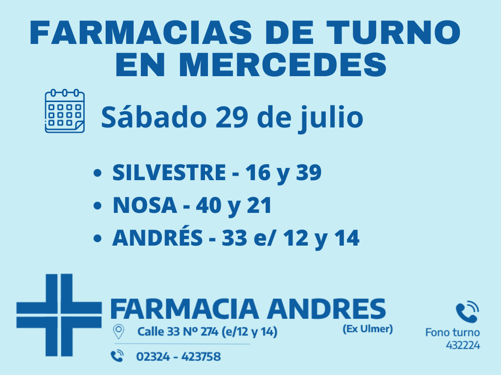 Desde las 8:30 del día de hoy hasta la misma hora de mañana, las farmacias de turno en Mercedes son: Silvestre, Nosa y Andrés.