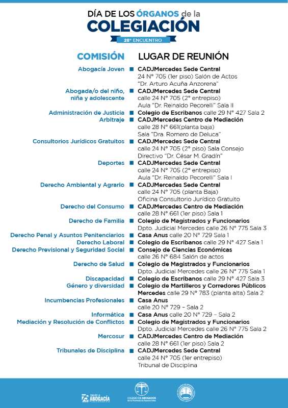– 21:00 hs: Cena de autoridades del CADJMercedes, COLPROBA, CAJA y Abogacía Joven en Puerta Negra, ubicada en las Avenidas 29 y 40.