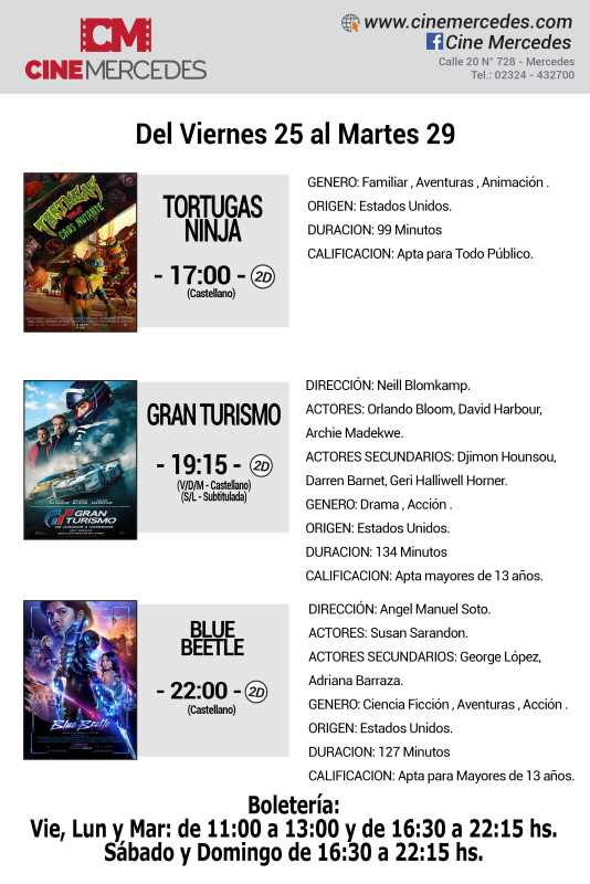 El Cine Mercedes presenta entre el viernes 25 y el martes 29 de agosto, tres películas en donde la acción y la aventura destacan en cada una de las historias. En la función de las 17, las Tortugas Ninjas siguen en pantalla al igual que Blue Beetle en la función de la hora 22. El estreno de la semana es Gran Turismo, en la función de las 19:15.
