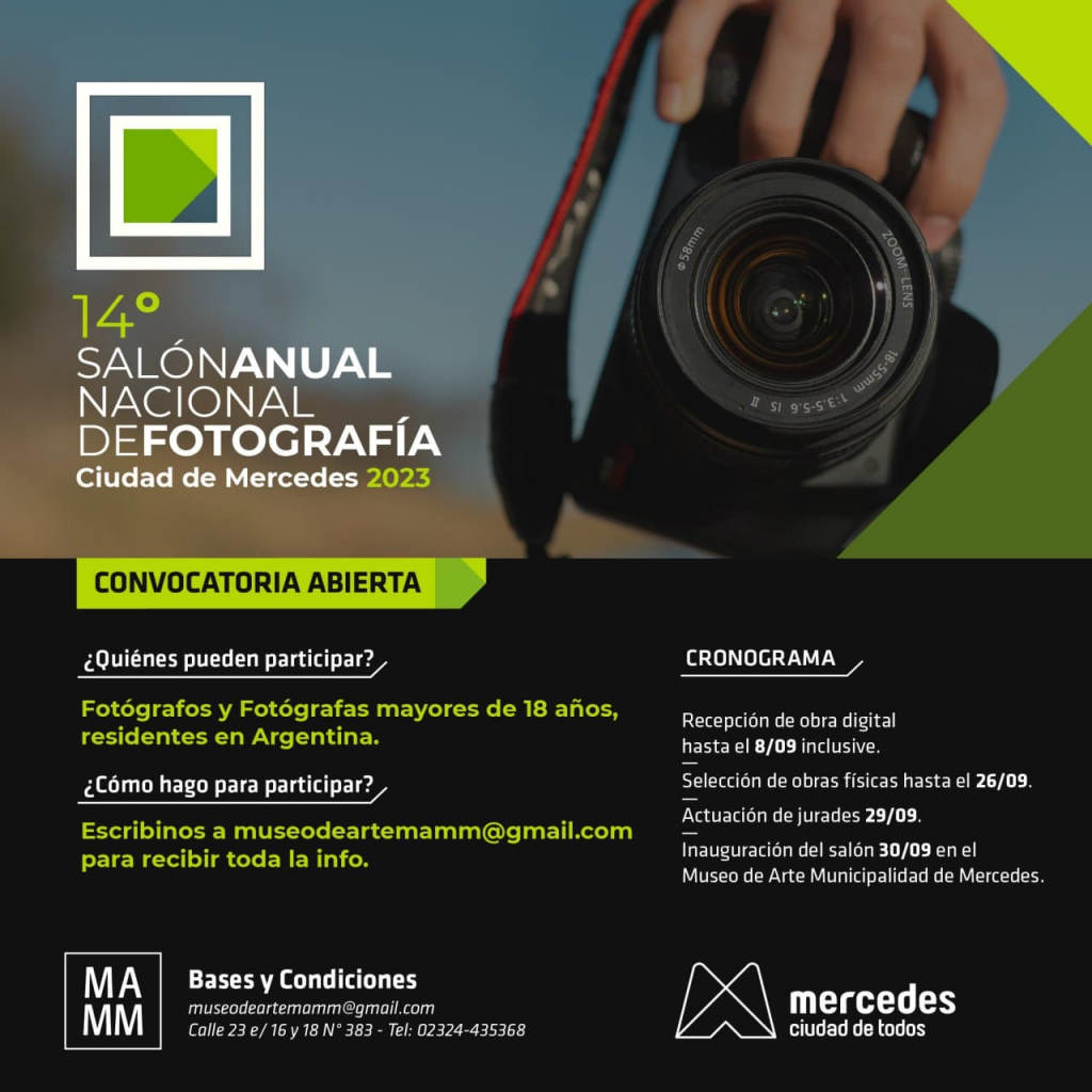 Desde el área de Cultura del Municipio de Mercedes lanzaron la convocatoria abierta para el 14° Salón Anual Nacional de Fotografía. Ya está el reglamento de la nueva edición para que sea solicitada al Museo de Arte Municipalidad de Mercedes (MAMM). Se puede solicitar a través del correo museodeartemamm@gmail.com. Hay tiempo de presentar la obra hasta el 8 de septiembre inclusive.