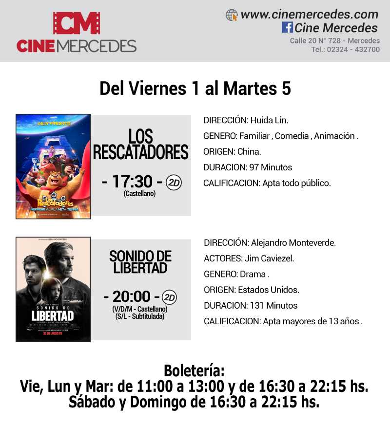 Desde el viernes 1 al martes 5 de septiembre, el Cine Mercedes presenta dos de los estrenos esperados de la semana. En la función de la hora 17:30 podrá verse «Los Rescatadores», mientras que a la hora 20 podrá verse «Sonido de Libertad».