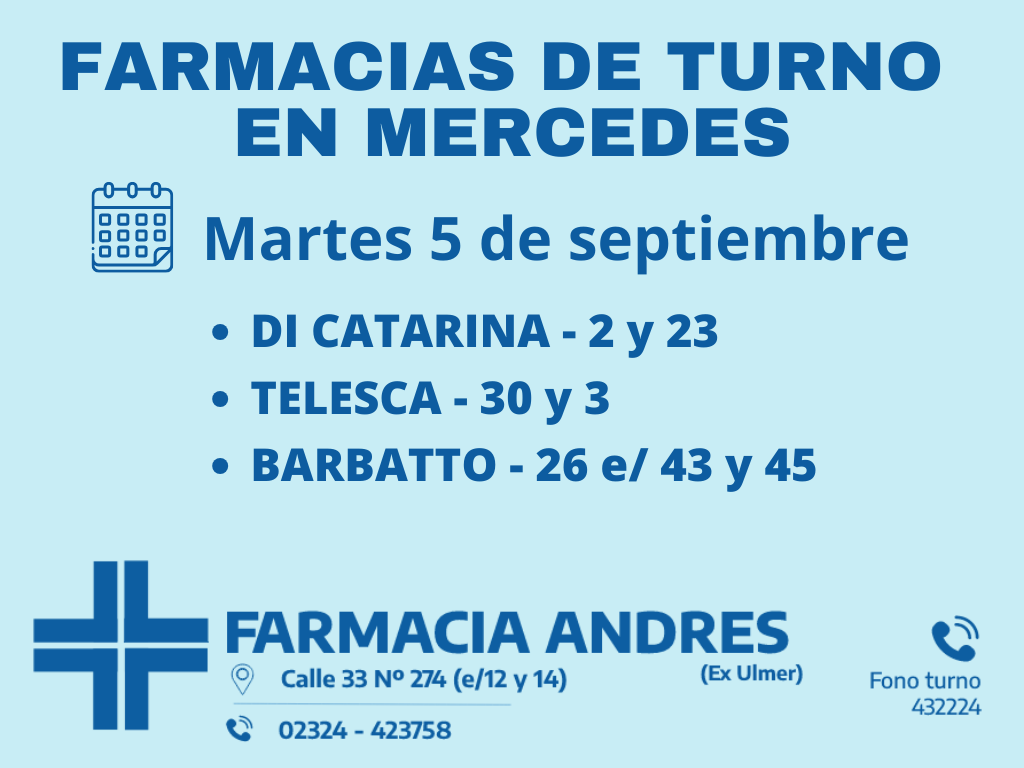 Desde las 8:30 del día de hoy hasta la misma hora de mañana, las farmacias de turno en Mercedes son: Di Catarina, Barbatto y Telesca.