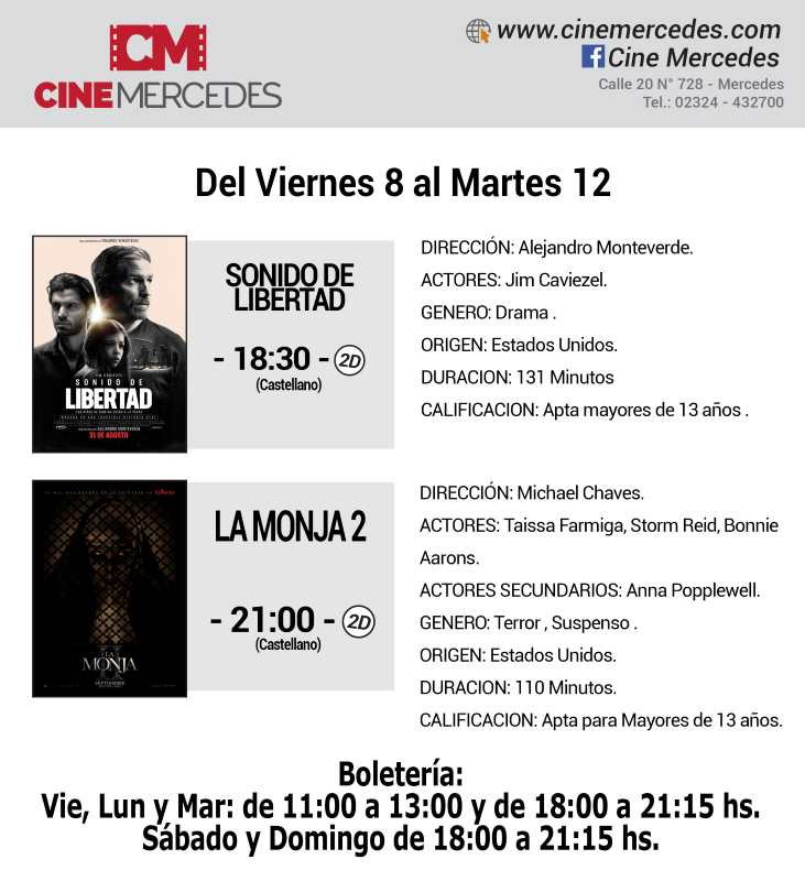 Desde el viernes 8 al martes 12 de septiembre, el Cine Mercedes continúa presentando el polémico film «Sonido de Libertad», mientras que el terror llega a la pantalla local de la mano de La Monja 2.