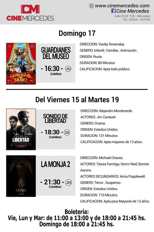 El Cine Mercedes anunció una semana especial de proyección ya que el sábado cerró para participar de una actividad en Luján. No obstante, domingo, lunes y martes proponen diferentes películas para diversos públicos. En la función de las 16:30 del domingo podrá verse «Guardianes del Museo», mientras que en las funciones de las 18:30 y de las 21:30 del resto de los días continúan con «Sonido de Libertad» y «La Monja 2»