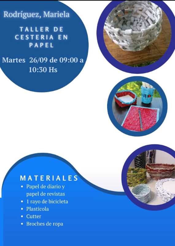 De 9 a 10:30 horas. Taller de Cestería en Papel. A cargo de Mariela Rodríguez.