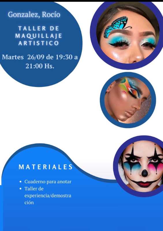 De 19:30 a 21 horas. Taller de Maquillaje Artístico. A cargo de Rocío González.