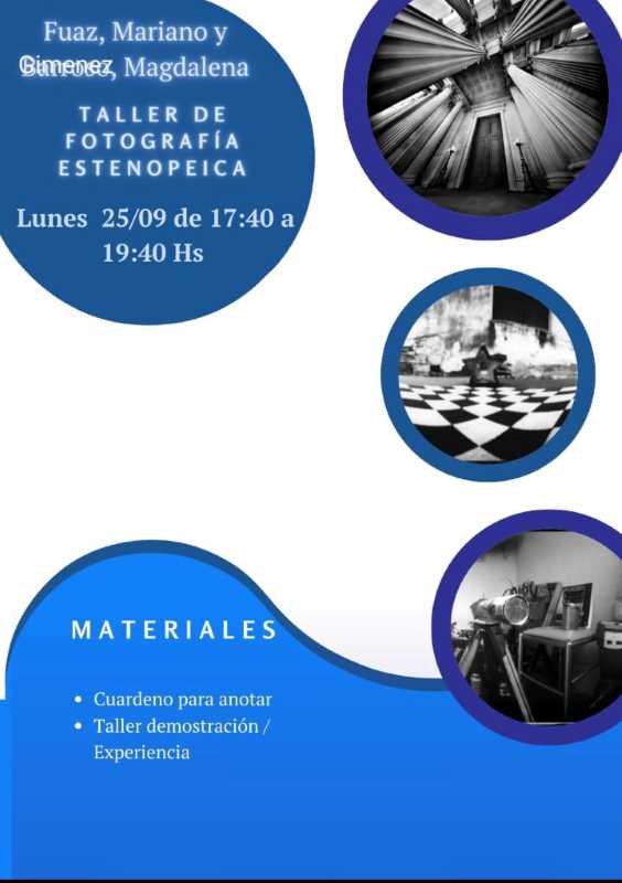 De 17:40 a 19:40 horas. Taller de Fotografía Estenopeica. A cargo de Mariano Fuaz y Magdalena Giménez.