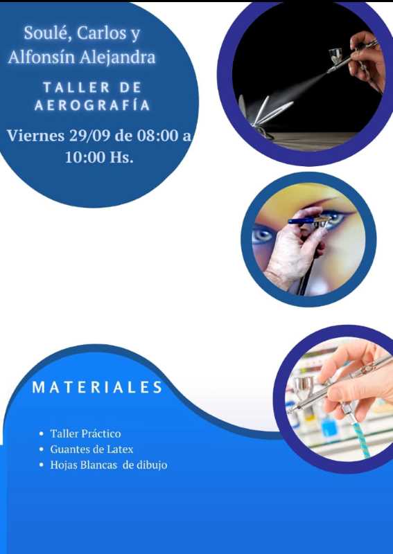 De 8 a 10 horas. Taller de Aerografía. A cargo de Carlos Soulé y Alejandra Alfonsín.