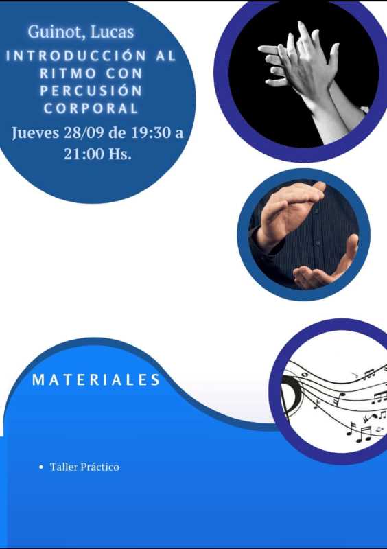 De 19:30 a 21 horas. Intruducción al Ritmo con Percusión Corporal. A cargo de Lucas Guinot.
