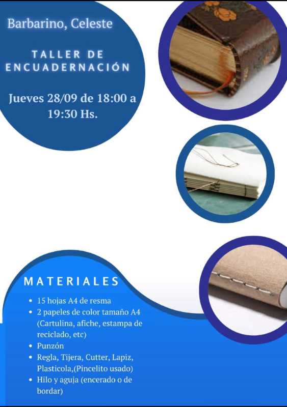 De 18 a 19:30 horas. Taller de Encuadernación. A cargo de Celeste Barbarino.
