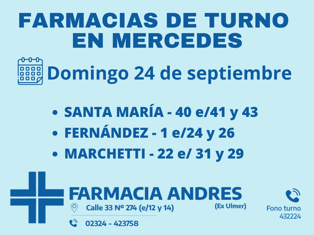 Desde las 8:30 de hoy hasta la misma hora de mañana las farmacias de turno en Mercedes son Santa María, Fernández y Marchetti.