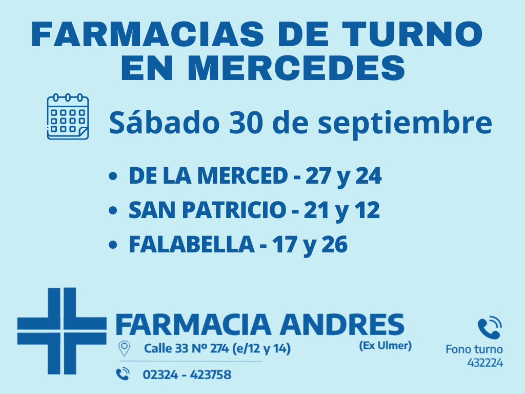 Desde las 8:30 del día de hoy hasta la misma hora de mañana, las farmacias de turno en Mercedes son: De la Merced, San Patricio y Falabella.