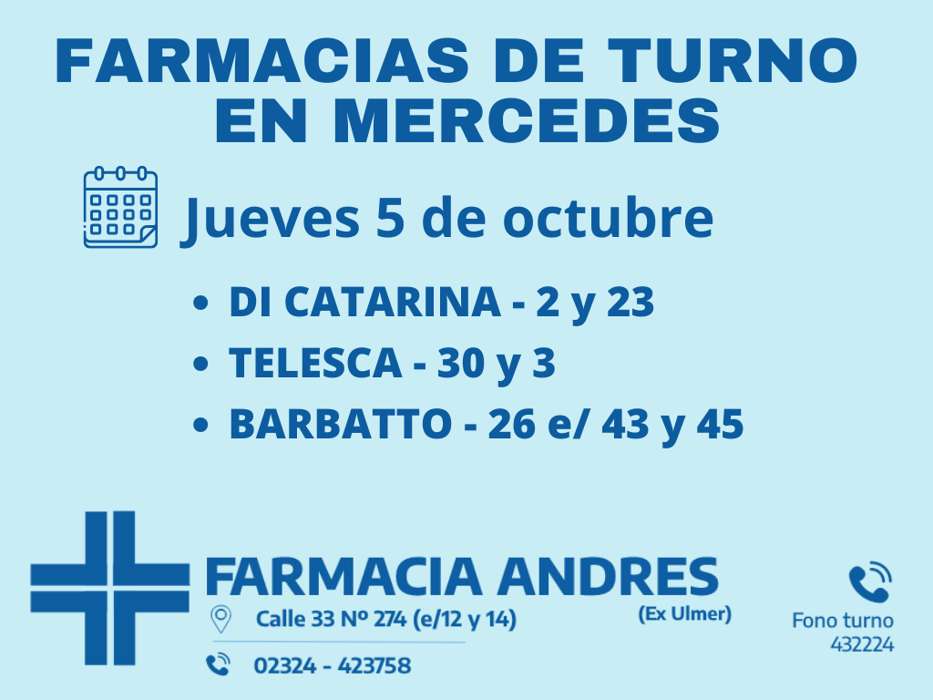 Desde las 8 30 del día de hoy hasta la misma hora de mañana las farmacias de turno en Mercedes son Di Catarina, Telesca y Barbatto.