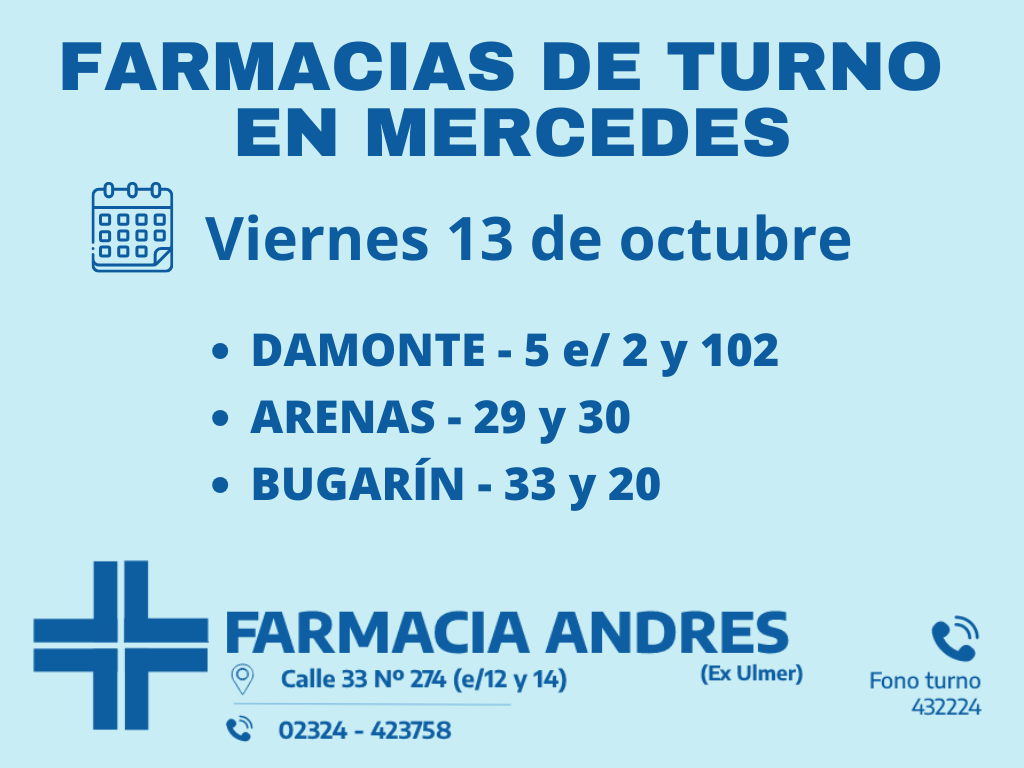 Desde las 8 30 del día de hoy hasta la misma hora de mañana las farmacias de turno en Mercedes son Damonte, Arenas y Bugarín.
