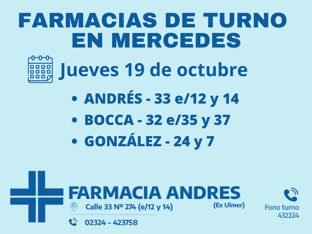 Desde las 8:30 del día de hoy hasta la misma hora de mañana, las farmacias de turno en Mercedes son: Andrés, Bocca y González.