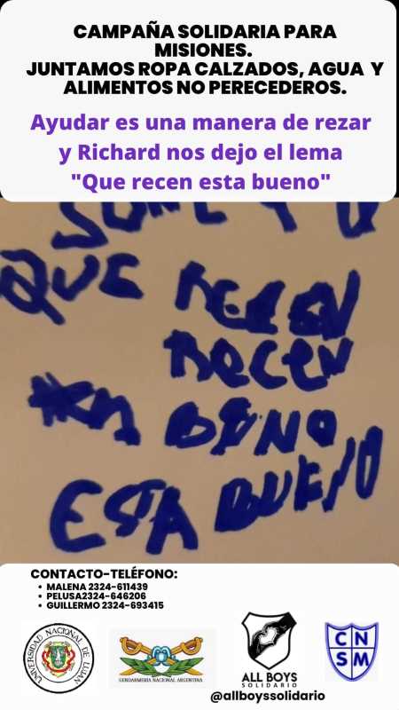La campaña es llevada adelante por All Boys Solidario junto al Colegio Misericordia, la Universidad de Luján y Gendarmeria Nacional en la logística. Los interesados en donar pueden contactarse con Malena (232461439), Guille (2324693415) y Pelu (2324646206)