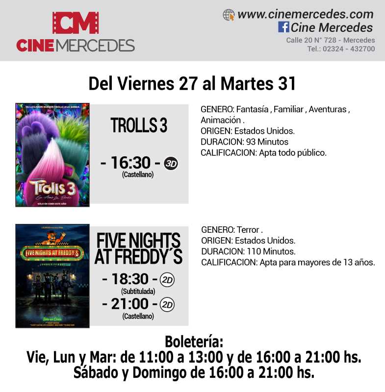 Desde el viernes 27 al martes 31 de octubre, el Cine Mercedes propone una cartelera con dos películas. Una de animación y para la familia y otra de terror. Trolls 3 en la función de la hora 16:30, mientras que Five Nights at Freddy’s tendrá dos funciones por día 18:30 y 21 horas.