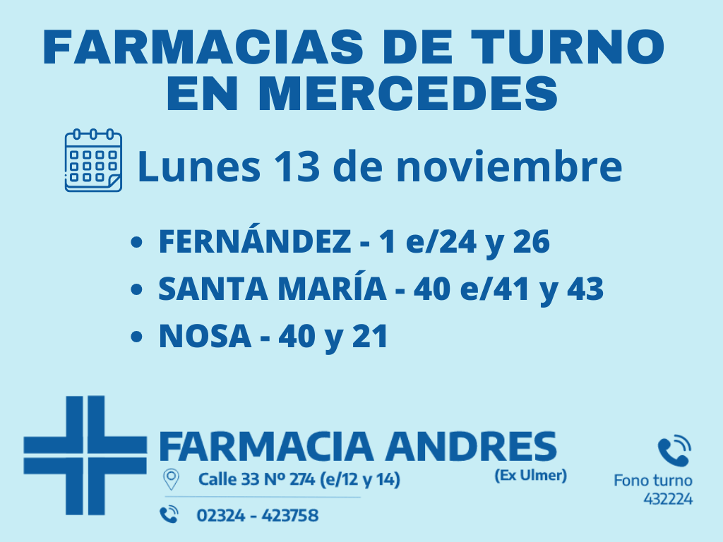Desde las 8:30 del día de hoy hasta la misma hora de mañana, las farmacias de turno en Mercedes son: Fernández, Santa María y Nosa.