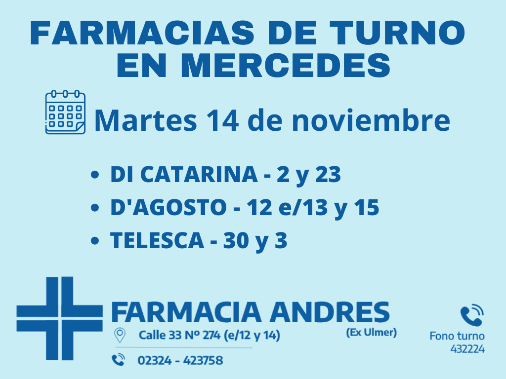 Desde las 8:30 del día de hoy hasta la misma hora de mañana, las farmacias de turno en Mercedes son: Di Catarina, D’Agosto y Telesca.