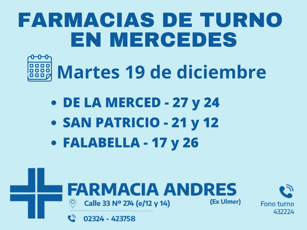 Desde las 8 30 del día de hoy hasta la misma hora de mañana las farmacias de turno en Mercedes son De la Merced, San Patricio y Falabella