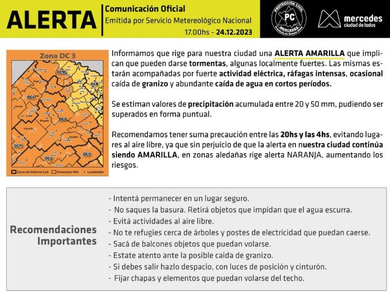 Comunicación Oficial emitida por Servicio Metereológico Nacional – Se emitió una alerta para la tarde noche del domingo en donde Mercedes se encuentra en alerta amarilla, mientras la región se encuentra en alerta naranja.