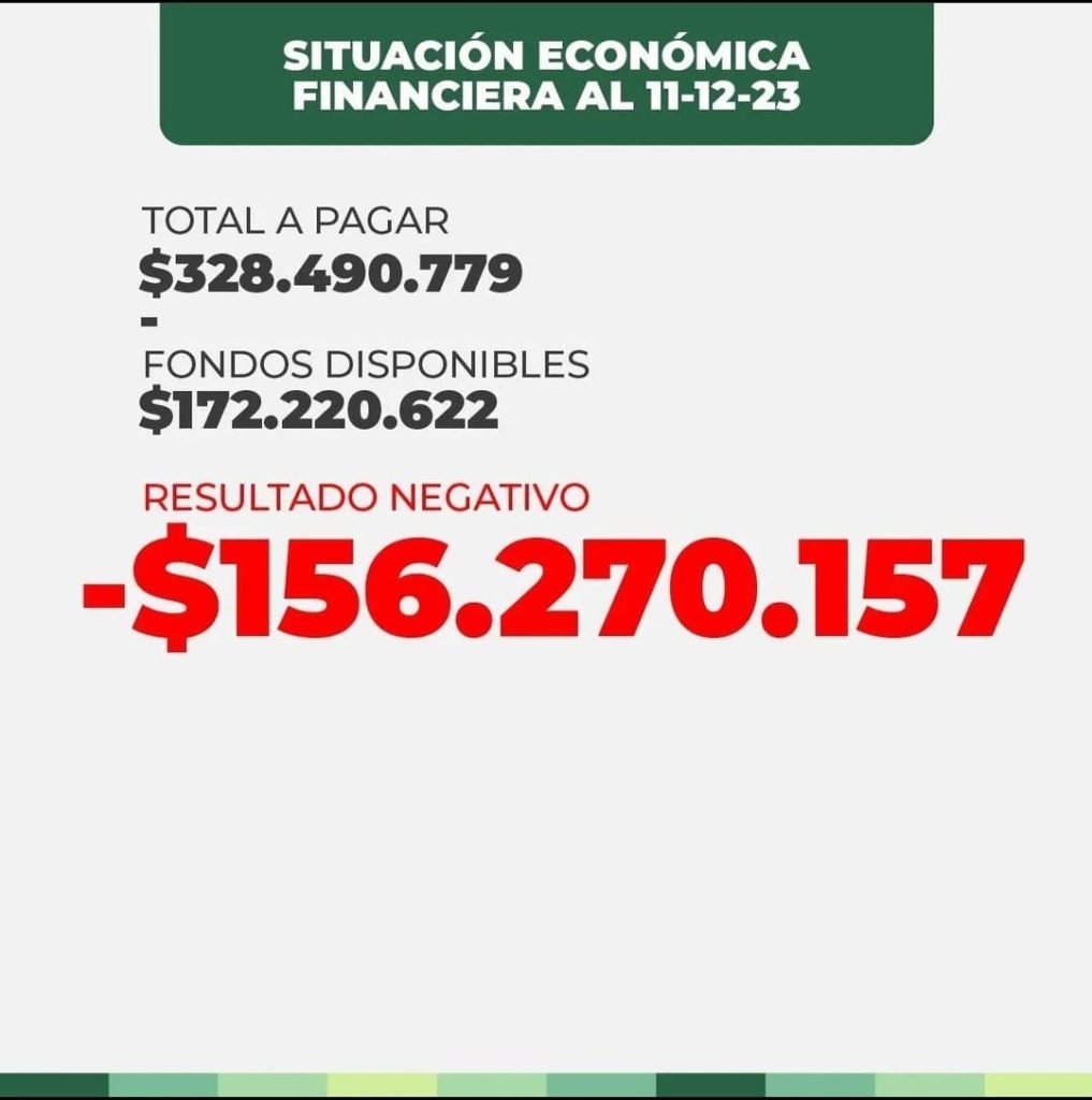 La situación económica y financiera en que quedó Suipacha tras el gobierno de Cambiemos y asumió Mancini es de suma gravedad. Así lo narró el propio recien asumido intendente en un video publicado en sus redes sociales el intendente Juan Luis Mancini le habló a toda la comunidad para contarles de forma concreta y con datos, el estado en que recibió el municipio el 11 de diciembre. En el año 2022 la gestión anterior cerró el ejercicio con un resultado financiero positivo de $ 63 millones, mientras que al cierre del 2023 arrojó un resultado financiero negativo de $156 millones.