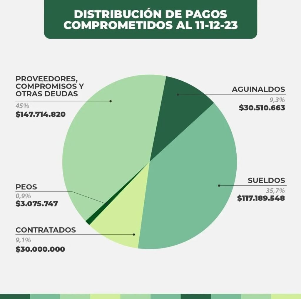 Esta deuda se explica básicamente en la falta de pago de compromisos, proveedores y el mal uso de partidas y fondos afectados, como por ejemplo el fondo educativo y del Programa Comunidades sin Violencia. Esta deuda comprende el 45% del total, repartiendo el resto entre el pago de aguinaldos, sueldos y contratos. Por lo tanto, que la suma total de estos compromisos de pago asciende a $328 millones, y teniendo disponible para afrontar estos compromisos tan solo $172 millones, lo que arroja un saldo negativo de $156 millones.