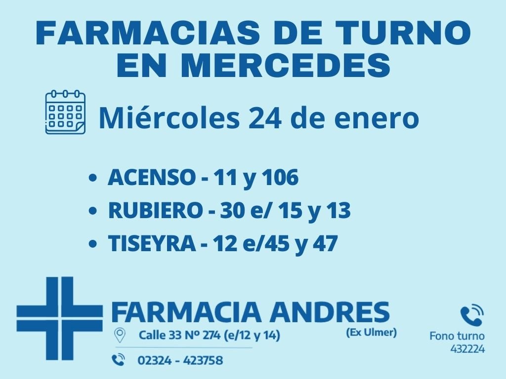 Farmacias de turno del miércoles 24 de enero 24 enero, 2024Desde la 8:30 del día de hoy hasta la misma hora de mañana las farmacias de turno en Mercedes son Acenso, Rubiero y Tiseyra.Comparte esto: Haz clic para compartir en WhatsApp (Se abre en una ventana nueva) WhatsApp Haz clic para compartir en Telegram (Se abre en una ventana nueva) Telegram Haz clic para compartir en X (Se abre en una ventana nueva) X Haz clic para compartir en Facebook (Se abre en una ventana nueva) Facebook TE PUEDE INTERESARCOMENTARIOS Comentarios