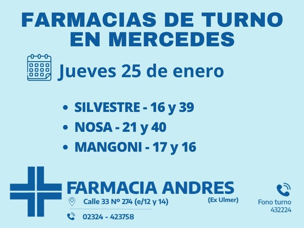 Desde las 8 30 del día de hoy hasta la misma hora de mañana las farmacias de turno en Mercedes son Silvestre, Nosa y Mangoni.