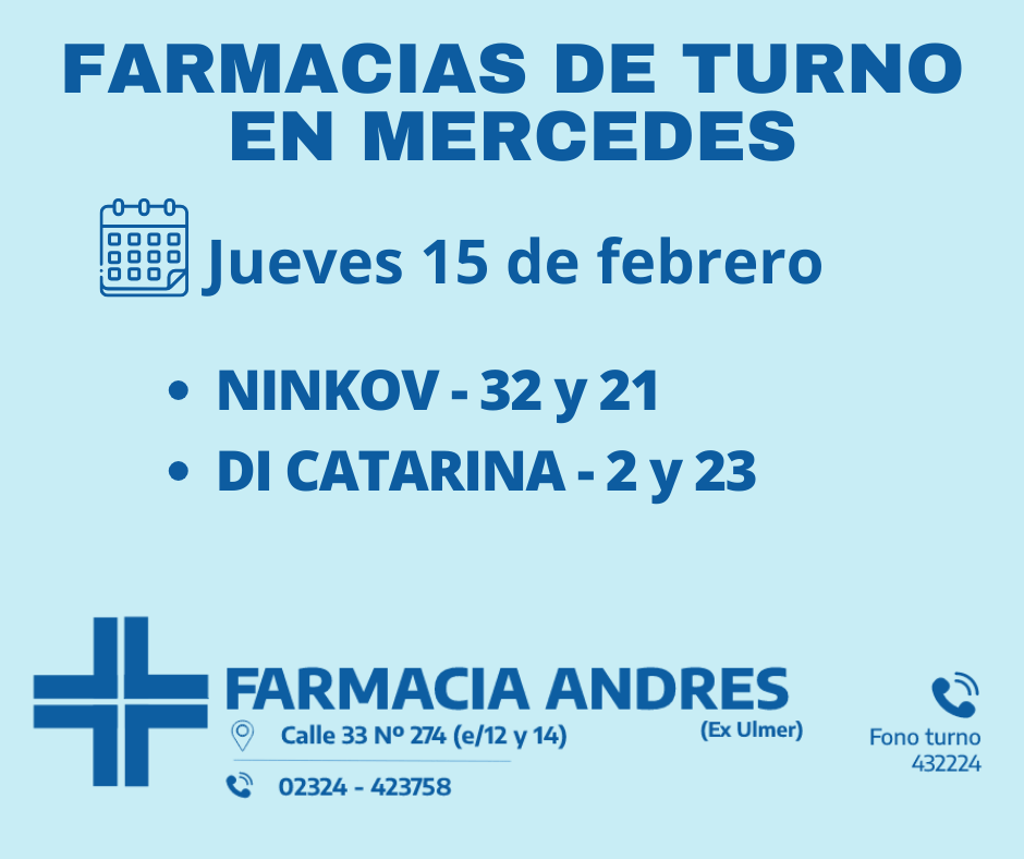 Farmacias de turno del jueves 15 de febrero 15 febrero, 2024Desde las 8:30 del día de hoy, hasta la misma hora de mañana las farmacias de turno en Mercedes son Ninkov y Di Catarina.Comparte esto: Haz clic para compartir en WhatsApp (Se abre en una ventana nueva) WhatsApp Haz clic para compartir en Telegram (Se abre en una ventana nueva) Telegram Haz clic para compartir en X (Se abre en una ventana nueva) X Haz clic para compartir en Facebook (Se abre en una ventana nueva) Facebook TE PUEDE INTERESARCOMENTARIOS Comentarios