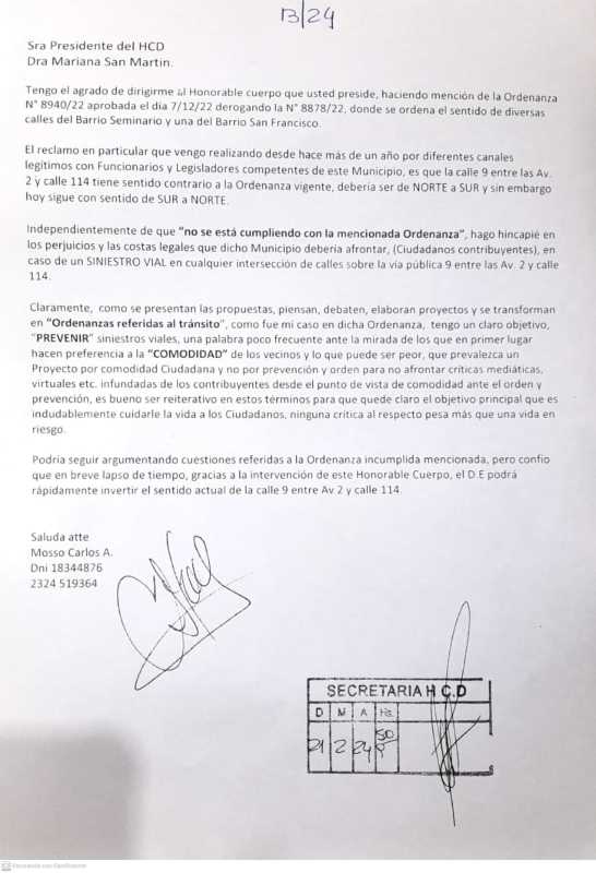 En el reclamo se pide que cumplan con la Ordenanza N° 8940/22 – aprobada el día 7 de diciembre de 2022 – derogando la Ordenanza N° 8878/22, que trata sobre el sentido de determinadas calles del Barrio Seminario y especialmente de la Calle 9 entre Av. 2 y calle 114, ordenando que ésta tenga sentido Norte/Sur (desde avenida 2 a calle 114) ya que en la actualidad sigue teniendo sentido Sur/Norte (de 114 a 2).
