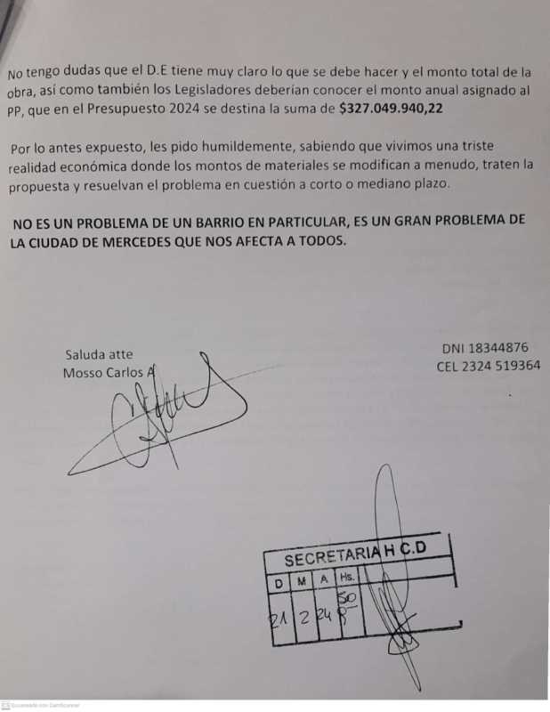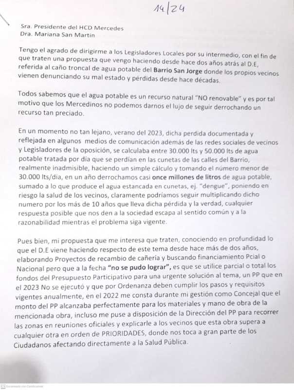 La otra presentación que hizo Mosso es un tema que deriva de la ordenanza relacionada con el presupuesto municipal. El ex concejal reiteró el pedido para que una de las partidas del presupuesto participativo se destine a una obra en el Barrio San Jorge que tiene que ver con pérdidas de agua corriente.