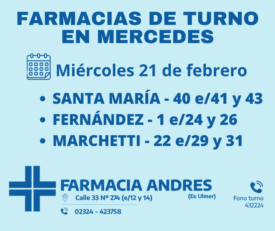 Desde las 8:30 del día de hoy hasta la misma hora de mañana, las farmacias de turno en Mercedes son: Santa María, Farnández y Marchetti.