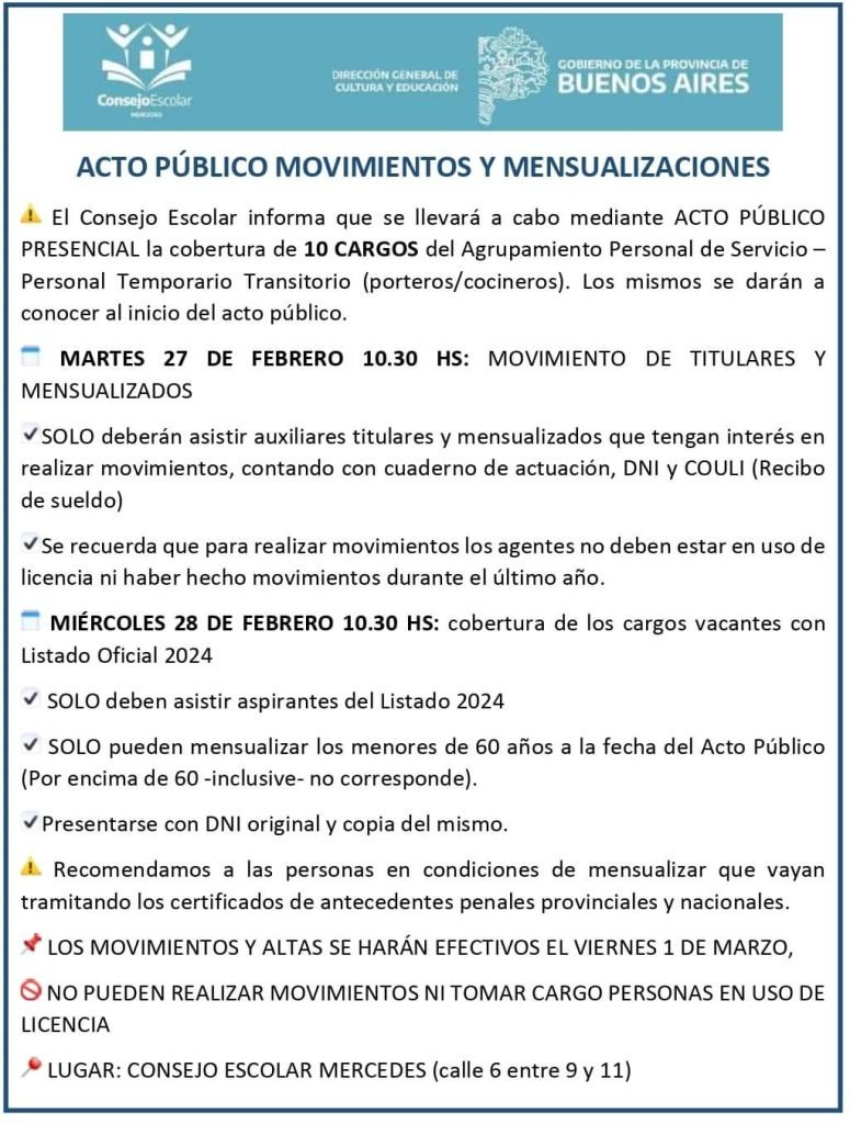 Desde el Consejo Escolar de Mercedes anunciaron que la última semana de febrero realizarán el acto público para la cobertura de diez cargos para auxiliares de educación. ños actos serán el martes 27 y el miércoles 28 de febrero.